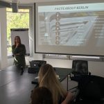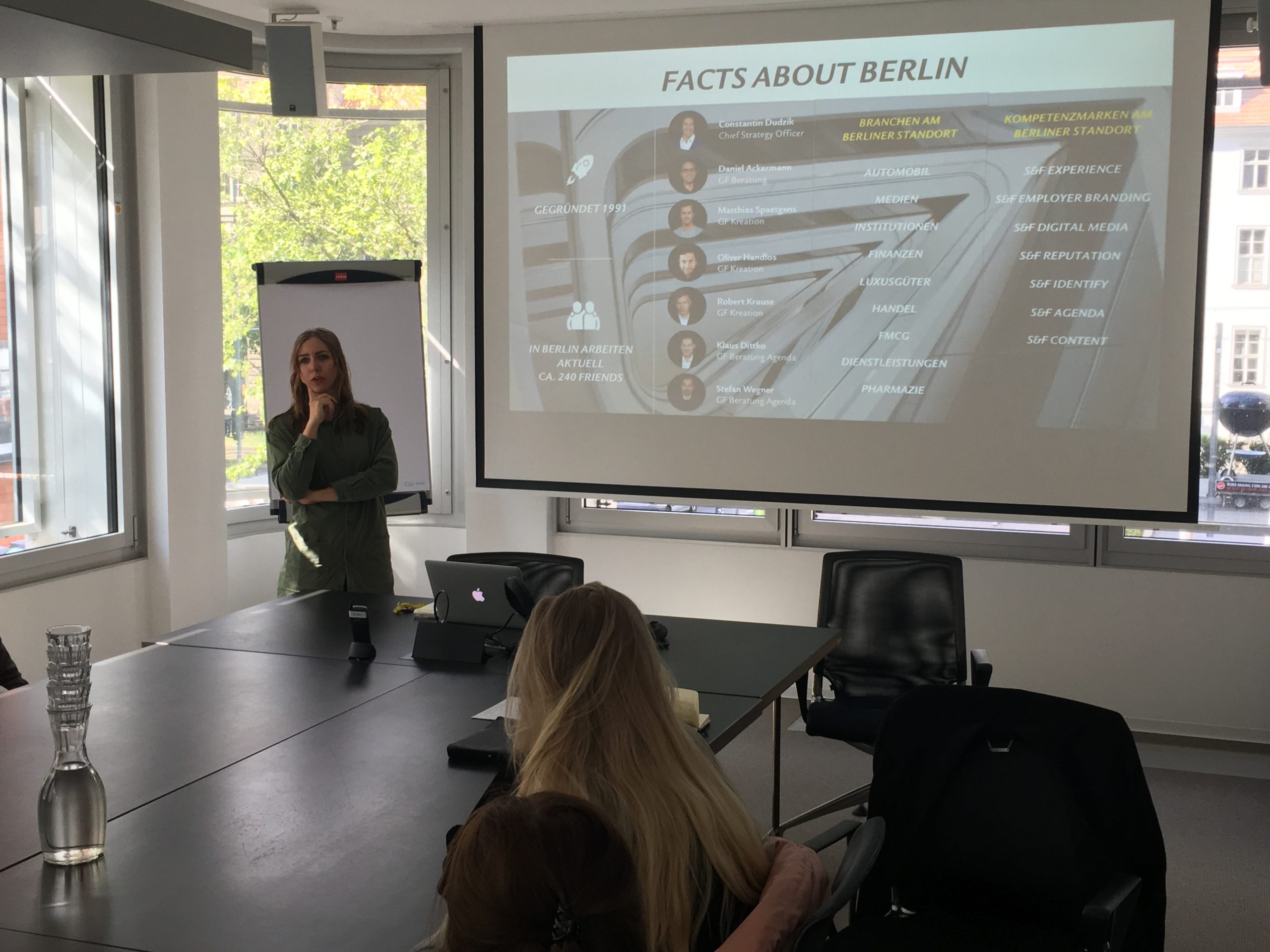 Stefanie Rümmler aus dem Bereich „People & Culture“ begrüßte die Gruppe im beeindruckenden Atrium des S & F-Domizils am Litfaßplatz 1 und gab zum Auftakt einen interessanten Überblick zur Entwicklung, zu den betreuten Branchen und Kunden sowie zu den Kompetenzmarken der Agentur. Die Prinzipien des „Runden Tisches“ und des „Orchesters der Ideen“ vermittelten den Studierenden instruktive Erkenntnisse zur Herangehens- und Arbeitsweise von Kreativen. Spannend waren auch die präsentierten Projekte und Kampagnen für den „Tagesspiegel“, „CAR 2 GO“ und die „Frankfurter Allgemeine Zeitung“, welche für zahlreiche Aha- und Wiedererkennungseffekte sorgten.