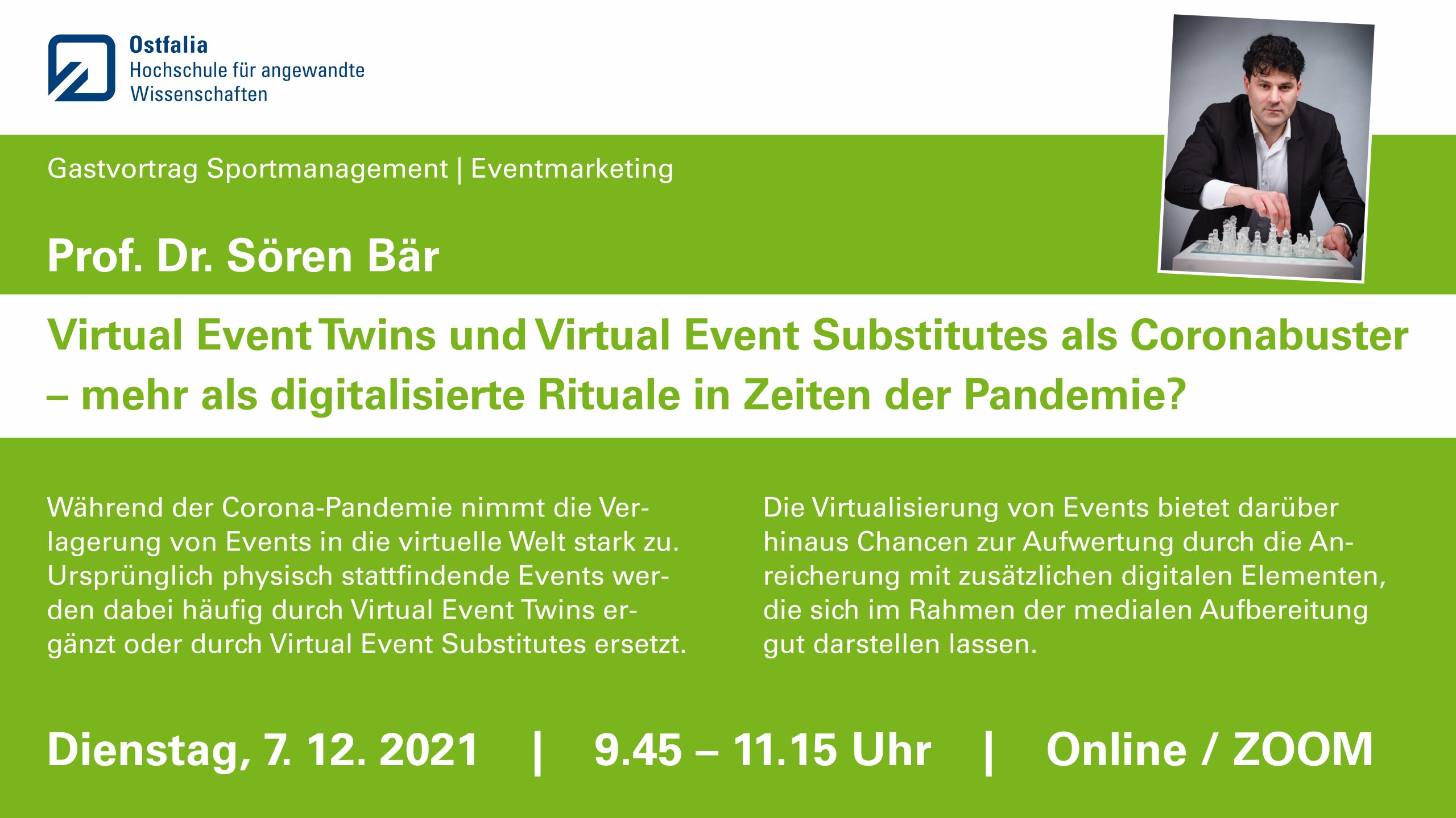 Am 07. Dezember 2021 hielt Prof. Dr. Sören Bär auf Einladung von Prof. Dr. Ariane Bagusat via ZOOM zwei Gastvorlesungen am Institut für Sportmanagement der Ostfalia Hochschule Salzgitter. Der mit 60 Teilnehmerinnen und Teilnehmern gut besuchte erste Vortrag am Vormittag war dem Thema  „Virtual Event Twins und Virtual Event Substitutes als Coronabuster – mehr als …