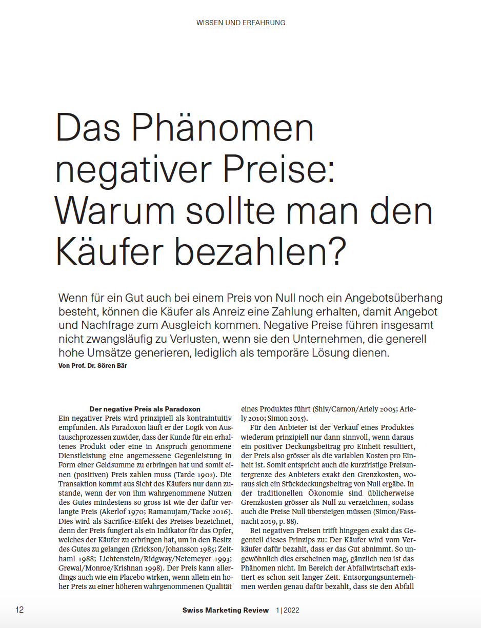 Prof. Dr. Sören Bär zum Paradoxon negativer Preise in der SWISS MARKETING REVIEW // Prof. Dr. Sören Bär on the paradox of negative prices in SWISS MARKETING REVIEW